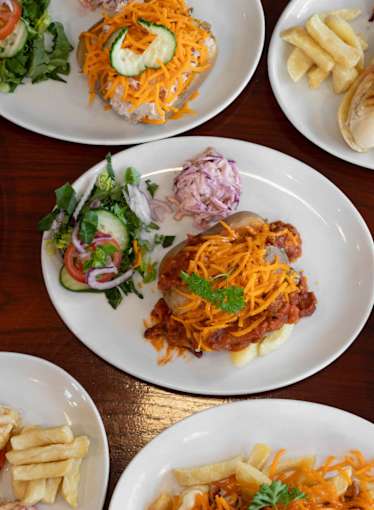 Fresh Beef Pan Fried with Onions and Garden Peas in a succulent and juicy Beef Stock, Layered with Fluffy Mashed potato and Topped with Grated Red Leicester Cheese. Oven Baked until Potato and Cheese Peaks are Golden Brown. Served with Chips, Peas, Yorkshire Pudding & Homemade Gravy.